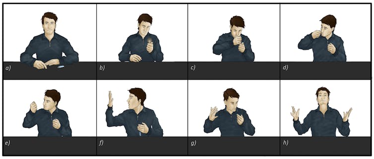 In the lighter trick, for example, a magician is seated at a table across from the viewer (a). He picks up the lighter and flicks it on (c–f). He pretends to take the flame away and make it vanish, providing a gaze cue as misdirection away from his other hand. At (f), the lighter is visibly dropped into his lap (g–h). The lighter appears to have vanished. Although the lighter is dropped in full view, half of the viewers completely fail to see this happen because they are distracted.